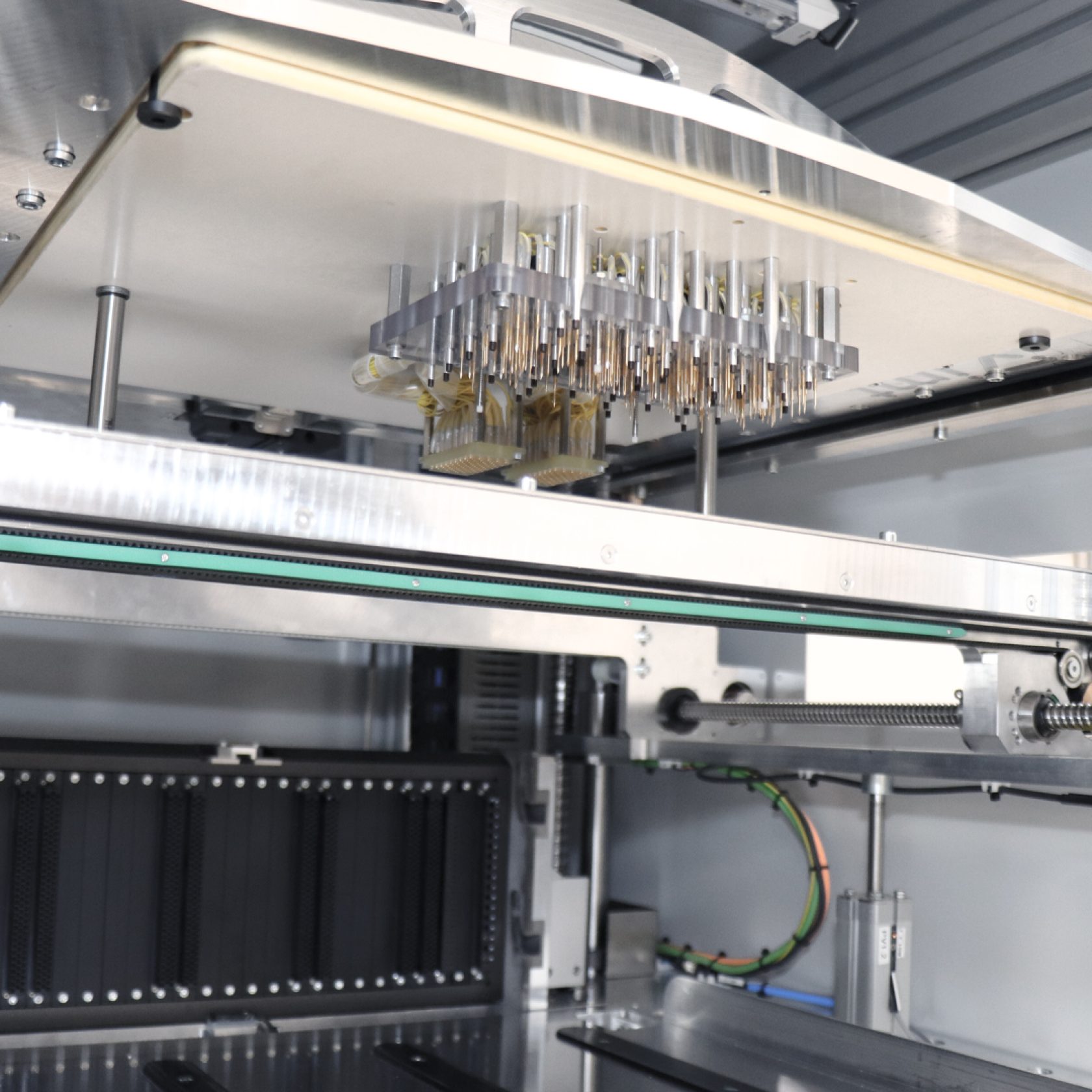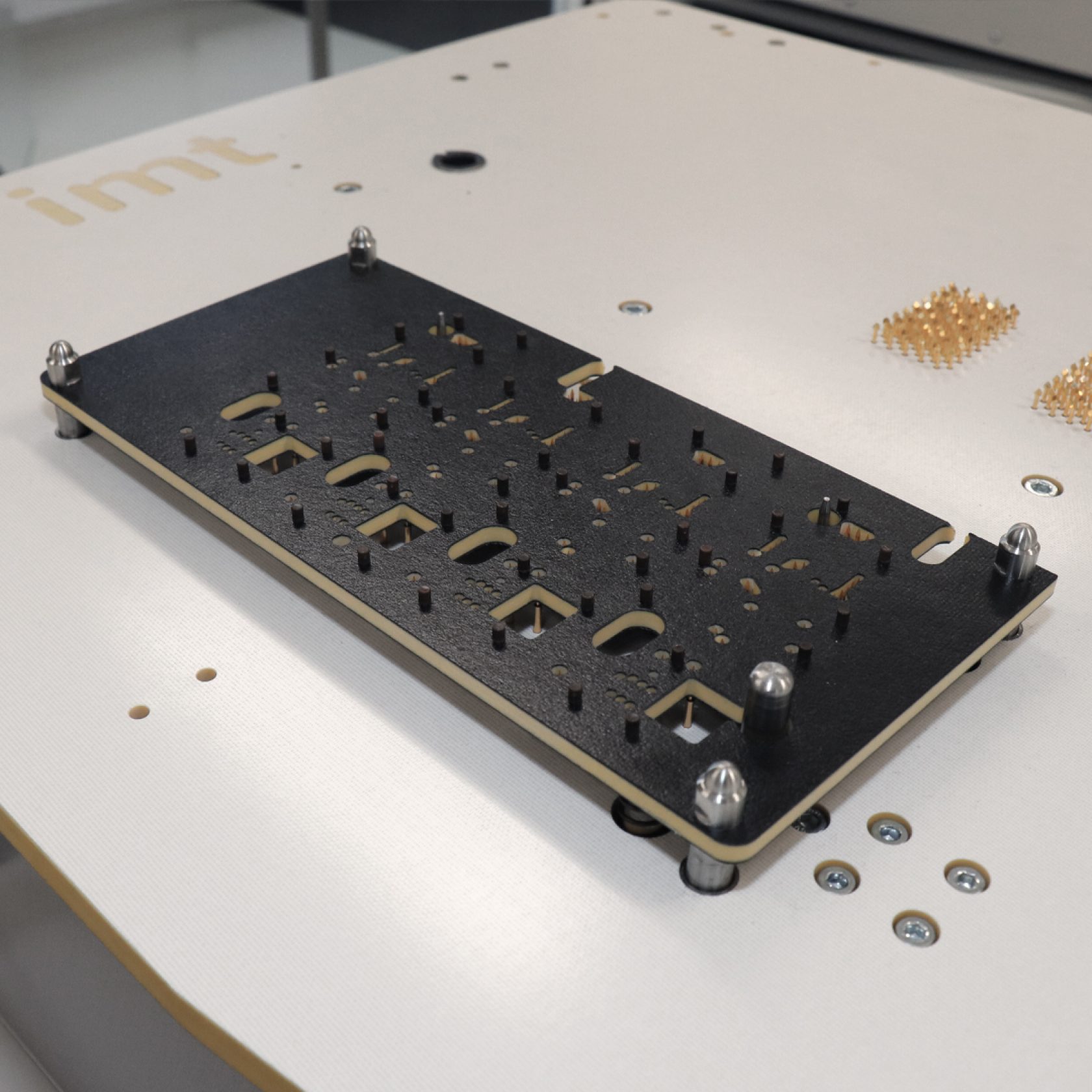 Pro samotné kontaktování ve fixturách využíváme odpružené kontaktní piny Feinmetall a samozřejmostí je i možná implementace dalších technologií souvisejících s výrobou desek plošných spojů, jako je například kontrola LED komponentů prostřednictvím FEASA či čtení kódů vzhledem k traceabilitě výrobku.
